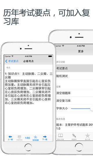 本软件为主管护师考试的软件,精心准备了2015年最新考试题库。(共计3400多道)分为不同题型,A1、A2、B1、A3、A4型题,并有答案解析。为考试的提供了充分的复习准备,可随时随地学习练习,有效帮...