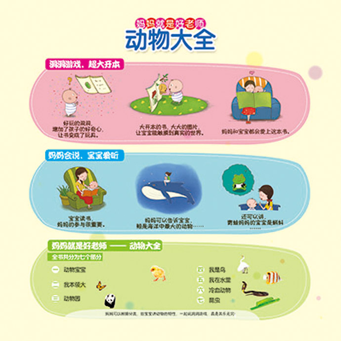 本从书共8册,内容涵盖认物、动物、果蔬食品、汽车、唐诗、儿歌、拼音、汉字八个方面,全面而经典,是妈妈给0到7岁宝宝进行启蒙教育的必备佳品! 本从书遵循孩子低幼时期妈妈是最重要的教育者这一理念,不仅仅给孩子提供教育启蒙的材料,也给妈妈提供最新最适合的教育方法。 书中有趣的洞洞设计,引导宝宝手、眼、脑并用,在玩中学,在学中玩,增加了孩子的好奇心!大开本的书,精美的图片,让宝宝能触摸到真实的世界!妈妈和宝宝都会爱上这套书!