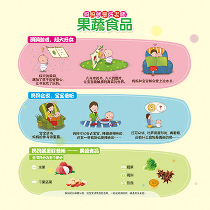 *本从书共8册,内容涵盖认物、动物、果蔬食品、汽车、唐诗、儿歌、拼音、汉字八个方面,全面而经典,是妈妈给0到3岁宝宝进行启蒙教育的必备佳品! *本从书遵循孩子低幼时期妈妈是最重要的教育者这一理念,不仅仅给孩子提供教育启蒙的材料,也给妈妈提供最新最适合的教育方法。 *书中有趣的洞洞设计,引导宝宝手、眼、脑并用,在玩中学,在学中玩,增加了孩子的好奇心!大开本的书,精美的图片,让宝宝能触摸到真实的世界!妈妈和宝宝都会爱上这套书!