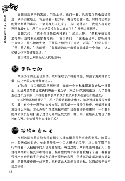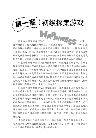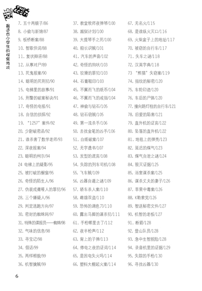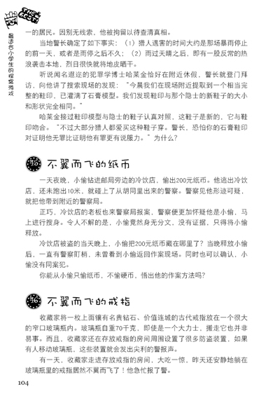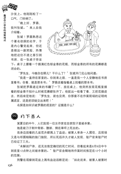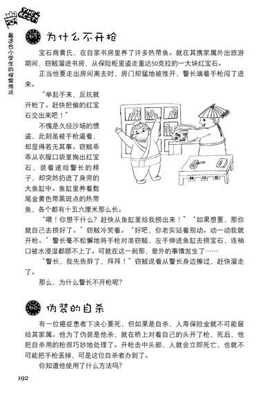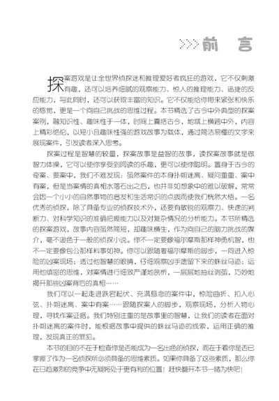 本书精选了古今中外典型的探案案例,融知识性、趣味性于一体,时间上囊括古今,地域上横跨中外,内容上精彩绝伦,以短小且趣味性强的游戏故事为载体,通过简洁易懂的文字来展现案件,引发读者深入思考。书中所精选的探案游戏,故事内容虽然简短,却趣味横生:作为向自己的脑力挑战的媒介,毫不逊色于一般的侦探小说。你不一定要像福尔摩斯那样神勇机智,也不一定要像包公那样料事如神。你可以跟随着福尔摩斯的脚步,一同进入惊险的凶案现场;透过他智慧的眼睛,仔细观察凶手遗留下来的蛛丝马迹;运用他缜密的思维,对案情进行细致严谨地剖析,一层层地抽丝剥茧,巧妙地揭开那些凶案背后的真相……