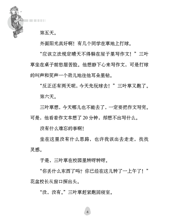 三叶草想,今天哪儿也不能去了,一定要把作文写完。可是,他看着作文本想了20分钟,却想不出写什么。
