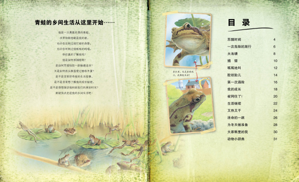 苏醒时间 一次危险的旅行 大池塘 捕猎 呱呱地叫 胶状胎儿 第一次遇险 我的成长 被网住了! 生活继续 又热又干 活命的一跳 为冬天做准备 大家眼里的我 动物小辞典
