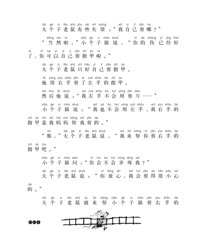 大个子老鼠是男生,真诚、友爱,小个子猫是女生,美丽、善良,他们之间发生了许多令人难忘的故事,每个故事都是那么温馨美好,洋溢着友爱的气息。剪指甲/001