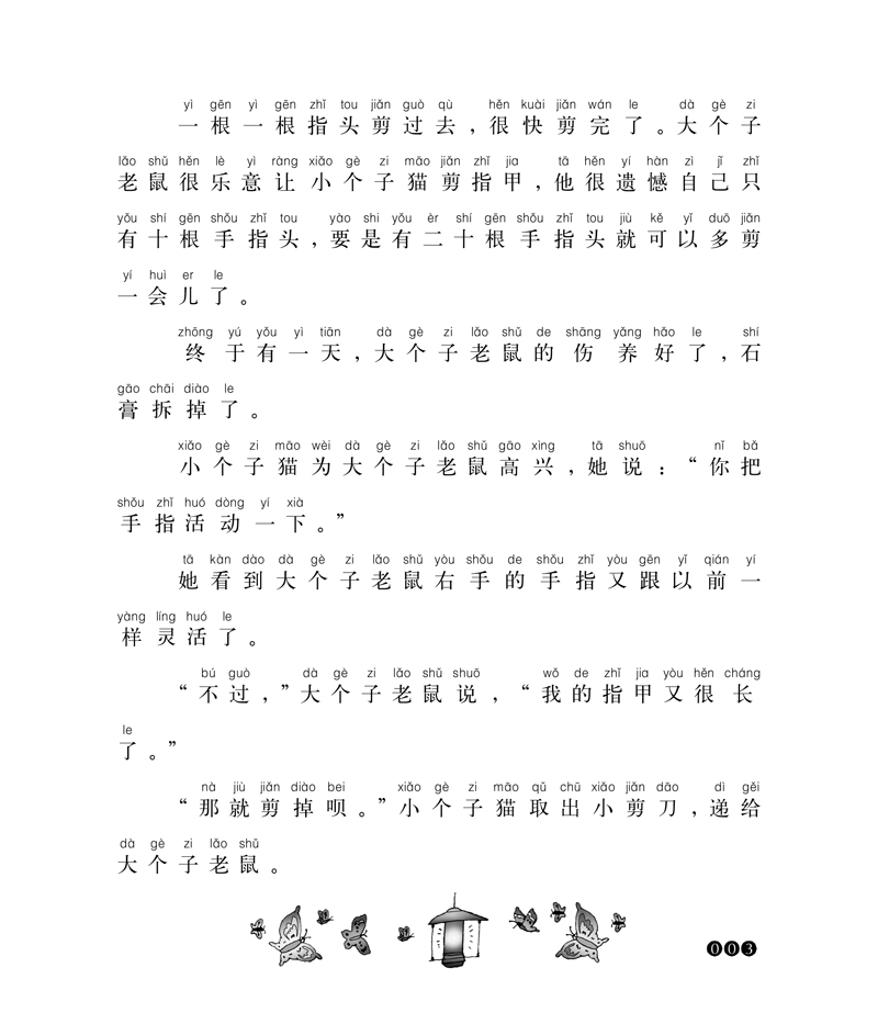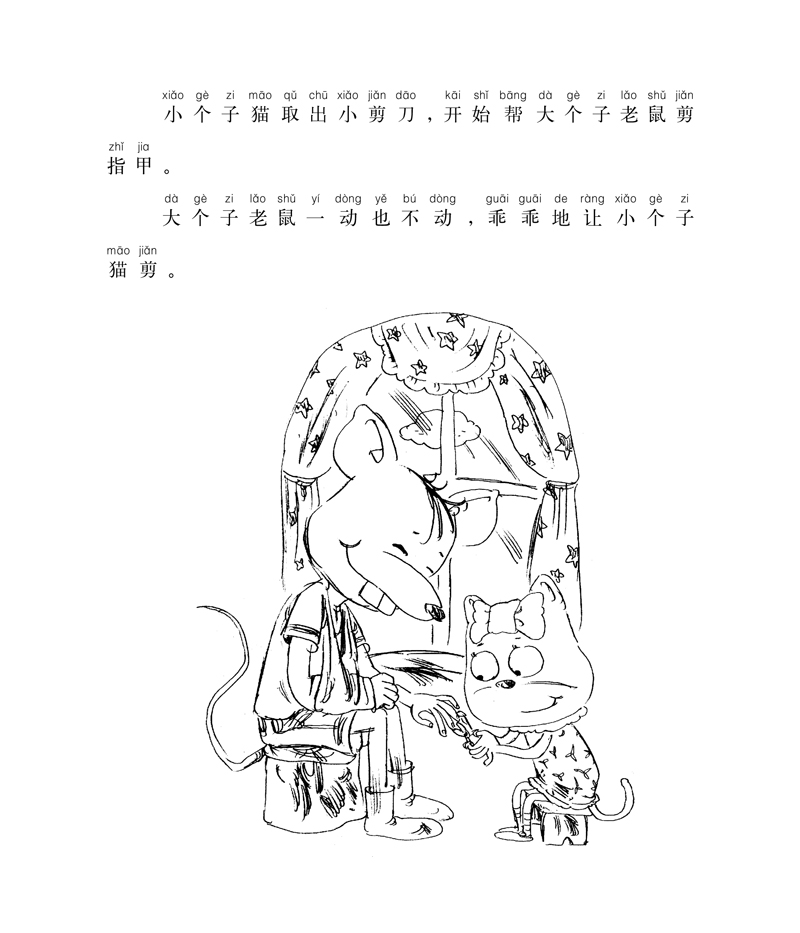 一根一根指头剪过去,很快剪完了。大个子老鼠很乐意让小个子猫剪指甲,他很遗憾自己只有十根手指头,要是有二十根手指头就可以多剪一会儿了。
