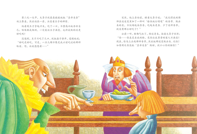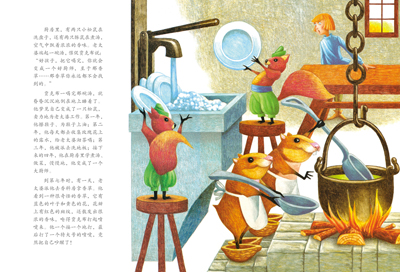厨房里,有两只小松鼠在洗盘子,还有两只豚鼠在煮汤,空气中飘着浓浓的香味。老太婆端起一碗汤,催促贾克布说:“好孩子,把它喝完,你就会变成一个好厨师,至于那香草……那香草你永远都不会找到的。”