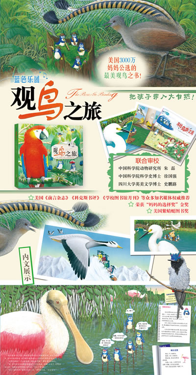 "这是一套想象力丰富的绘本故事书,也是一套幽默风趣的儿童科普书。跟随着蓝色乐团的五只小蓝鸟,小朋友们可以穿越美洲、巡游海岸、环游世界,体验惊险、刺激、有趣的观鸟之旅!
