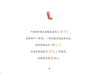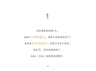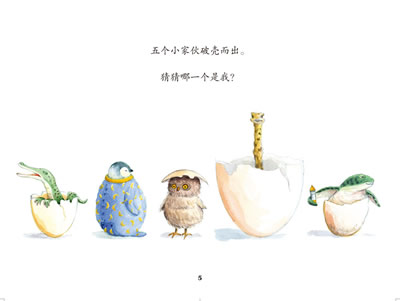 我穿着软软的睡衣。我抿了一口奶瓶儿,待会儿我就要出壳了!我伸着长长的脖子,发现了很多小家伙。我在哭,因为我想妈妈了。我把壳当成一顶很漂亮的帽子。五个小家伙破壳而出。猜猜哪一个是我? 下雨的时候我会躲在我的小伞下!我像树叶一样轻,一阵风甚至能把我吹走。我的伞像太阳一样金黄。我喜欢雨滴落在鼻尖上的感觉。我超喜欢踩水玩儿。五个小家伙在雨中漫步。猜猜哪一个是我