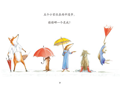 约里波瓦用铅笔和水彩赋予她笔下的动物一种优雅的韵味,哪怕这些动物穿着滑稽的脚蹼或者手中的伞被一阵狂风吹到了天上,它们仍然能保持这种优雅。五只水獭准备下河游泳,它们都穿着紫色的泳衣,但是又有细微的不同。有些不同很容易找出来,比如一个穿着两件式泳装,一个穿着圆点泳衣,一个戴着浴帽,一个正准备跳水。孩子们能轻松地找到和文字描述相对应的图片。还有些不同需要孩子们仔细地观察和思考。比如,五只浣熊里面,“躺在墙上真舒服”这句话指的是哪一只?对低幼的儿童来说,这本书引人入胜,吸引他们一读再读,一玩再玩。