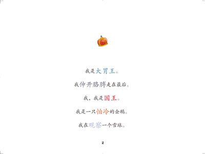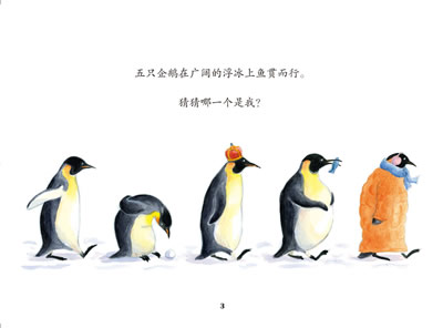 我是大胃王。我伸开胳膊走在最后。我,我是国王。我是一只怕冷的企鹅。我在观察一个雪球。五只企鹅在广阔的浮冰上鱼贯而行。猜猜哪一个是我?