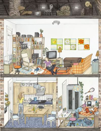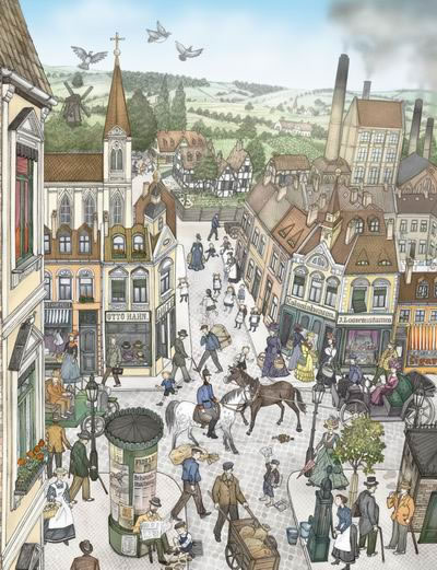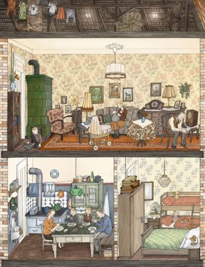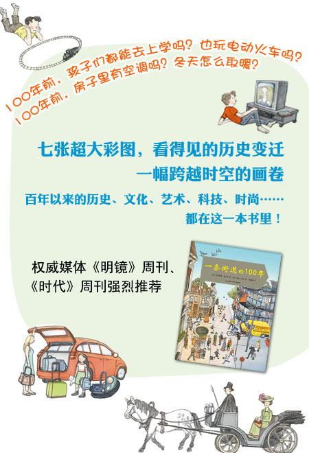 这是一本充满人文气息的绘本,打开这本书,仿佛走进了时空的长廊里:1911年、1933年、1945年……时光缓缓地流到今天,作者选取了7个有代表性的年代,用细致的笔触,描绘出100年中的家庭与社会的变化。在书中,你将走进寻常人家的阁楼、客厅、厨房和卧室,看看过去的家庭怎样洗衣做饭,人们怎样布置房间,孩子们玩些什么玩具,重大历史事件对生活产生了哪些影响;你还能亲临热闹的街道,去看一看1911年贵妇们的华美礼帽和长裙,1960年的甲壳虫汽车和商店,以及1980年的街道狂欢节……细节丰富的无声画面,融汇了百年中生活、环境、时尚、文化等方方面面的变迁和重要的历史事件。在这场再现历史的穿越之旅中,每个人所看到的画面是一样的,但每个人所发现的历史绝对不会相同。