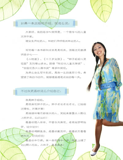 郁雨君,儿童文学专业硕士,毕业于上海师范大学人文学院。儿童文学作家,“花衣裳”里的辫子姐姐。青少年杂志资深编辑、策划人,现任《少女》杂志主编。主要创作特点是散文女生,小说男生,其别具一格的感性敏锐的理论与评论写作在在儿童文学界亦有一定影响。出版小说、散文书籍《女生对话》、《小桔屋——女孩子一个人的快乐》等18本。已在《中国图书商报》《文艺报》《新民晚报》及《儿童文学》《少年文艺》《中国儿童文学》《男生女生》等多家报刊发表小说、散文、文学论文、书评,人物专访、童话等100余万字。