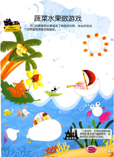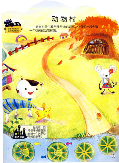 本书除配合游戏内容设计的6页贴纸外,还有我们送给孩子的“魔法精灵”贴纸,供孩子自由粘贴,家长也可将其作为奖励贴纸。另外,书后附赠的“益智魔法”大图,让孩子在自由操作和粘贴中,感受图形变换带来的惊喜,同时得到智能的开发。