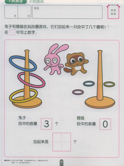 2.反复进行到1为止的加法练习及胡进位的加法练习。开始,通过“增加后一共是多少”,“加起来是多少”的练习,让孩子理解加法的意思。然后,利用符号(+、=)反复练习加法。练习内容由和到为止的加法、包含着0的加法个数字的加法和有进位的加法练习构成。