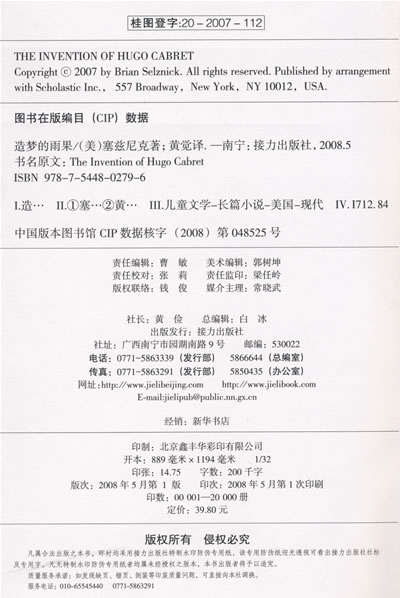 Cabret,接力出版社2008年出版)。故事的主人公是一个叫雨果的男孩,雨果的爸爸生前是个钟表匠,曾在工作的博物馆里发现一个坏了的但精致巧妙的机器人,父亲一面修理机器人,一面将修理的步骤写在笔记本里,并将笔记本作为生日礼物送给雨果。后来父亲离奇地丧生于博物馆的大火中,雨果执著地想修好这个能写字的机器人,想通过机器人写的字得知父亲想留给自己的信息。为了修理机器人,雨果经常去玩具店老人那里偷玩具,以便拆解出更多适合机器人的零件,却被老人逮个正着。老人发现了笔记本,非常震惊并没收了笔记本。在几经周折之后,在老人收养的女孩儿伊莎贝尔的协助下,雨果终于拿回了笔记本,修好了机器人。但是,机器人并没有像他们想象的那样,写出父亲留给自己的任何字。失望之时,他们却突然发现,机器人展示给他们更为离奇和复杂的信息。机器人最终写了什么?这里面为何有这样多的巧合?不要以为故事到这里就结束了,其实,它正是另一个故事的开始,而由此引出更复杂、更惊人的秘密。雨果的命运,以及周围人的命运,都随之发生了翻天覆地的变化。魔术、电影、梦想……构成了这个复杂神奇的悬疑故事。