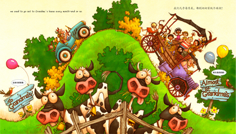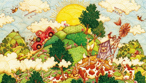 这首由约翰?丹佛的风靡一时的成名曲改编的精彩绘本,是关于血缘、关于家庭、关于乡村的。故事的背景在阿巴拉契亚山脉,一群多姿多彩的有趣亲戚们,有的开着汽车、有的开着小卡车、有的开着小货车或者骑着摩托车,在西弗吉尼亚山的山岗间上坡、下坡、转弯,向着爷爷奶奶家的乡间庭院开去,一家人即将团聚。为了体现阿巴拉契亚山脉的风格,绘者卡尼恩用了一种特殊的绘画方法,他像创作拼布被子一样,用细细的线条在“布块”之间勾勒出图案。让图画故事和音乐完美融合,当我们在翻动书页是,似乎可以闻到祖母家那张充满阳光气味的旧床单的味道。