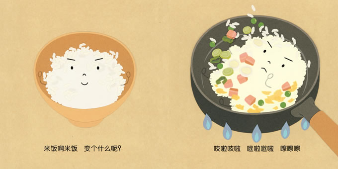 包一包,包一包,变成了饭团;炒呀炒,炒呀炒,变成了炒饭;煮呀煮,煮呀煮,加点菜叶,变成了菜粥;卷呀卷,卷呀卷,变成了寿司……