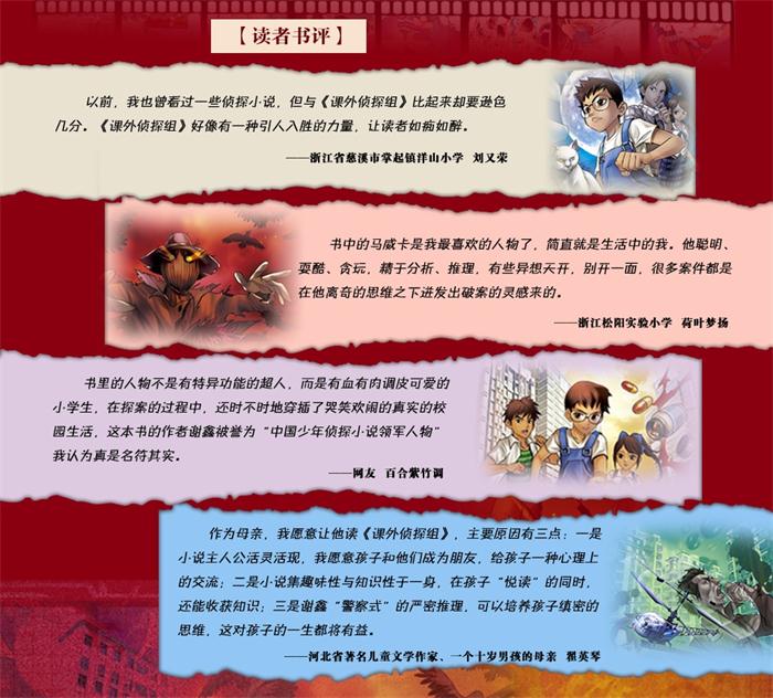 “课外侦探组”系列校园侦探小说是著名儿童文学作家、我国原创少年侦探小说领军人物谢鑫先生全力打造的一套长篇系列少年侦探作品。故事以小学生米多西、马威卡和欧木棋,三个喜爱推理探案的孩子为主人公,因为共同爱好,他们组成了一个叫“课外侦探组”的小团体,在米多西当刑警的表姐麦洁支持下,经过仔细观察、缜密分析、冷静推理、大胆假设、果断行动,最终破解各种扑朔迷离的谜题。该书情节跌宕曲折,故事精彩,语言诙谐、轻松、时尚,浅显易懂,而且注重逻辑推理,普及科学、法律知识,是广大少年儿童增长知识、提高智慧的最佳读物。