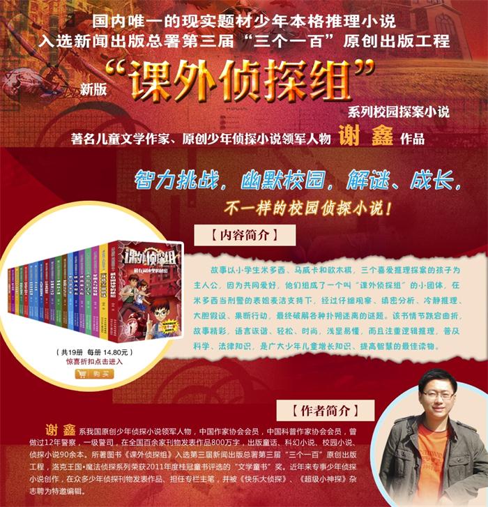 适合孩子阅读的少年侦探小说在近几年的童书市场愈发活跃,但多为引进的图书,我国原创的不多,看到青年作家谢鑫创作的现实题材本格推理小说《“课外侦探组”系列校园探案小说》很惊喜。