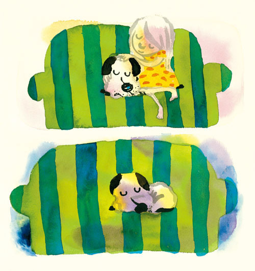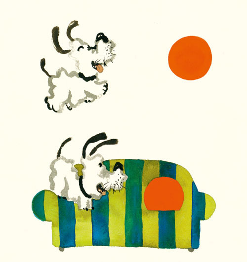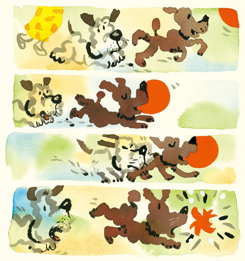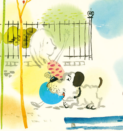 黛西有一个心爱的红球,她每日与红球相伴。一天,她和主人带球出去玩,遇到了一只棕色的小狗。小棕狗不小心把红球弄坏了,黛西伤心极了。回到家后,她在曾经与球相伴玩耍的沙发上沮丧地呆着。再次出门的时候,她又遇到了小棕狗,这次,小棕狗带来了一个蓝色的球——黛西失去了一件深爱之物,却获得了一个可爱的朋友。又或者,她什么也没失去。