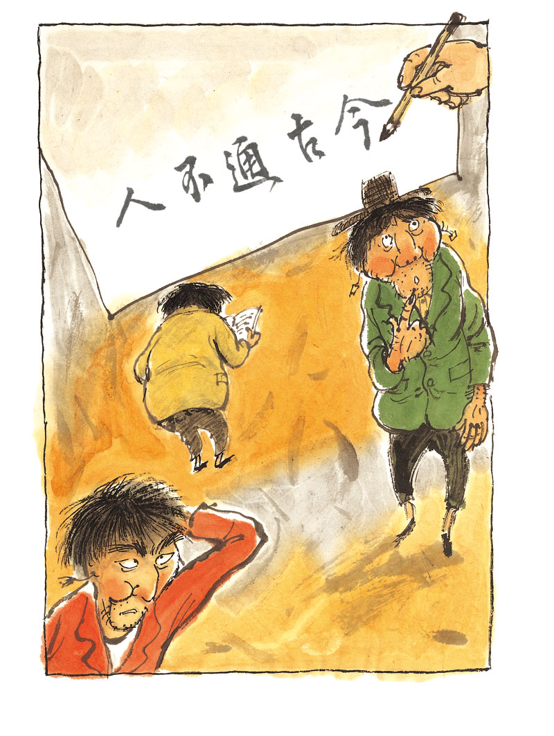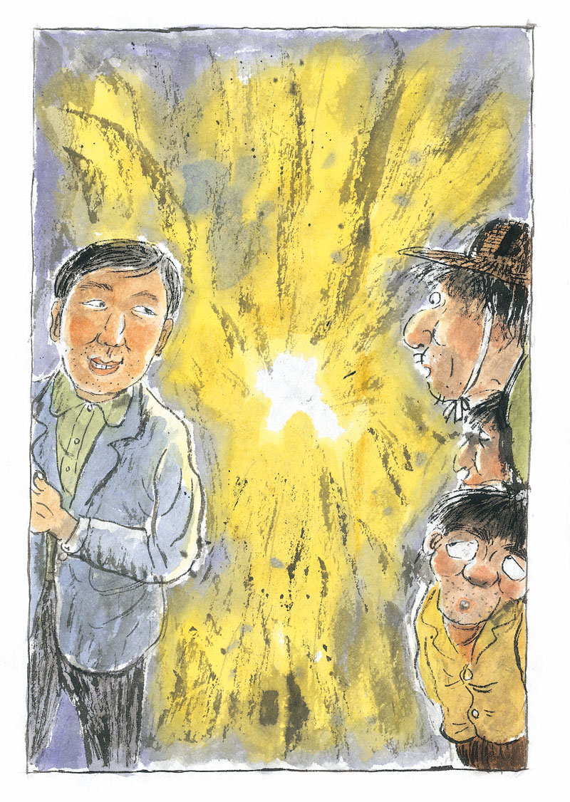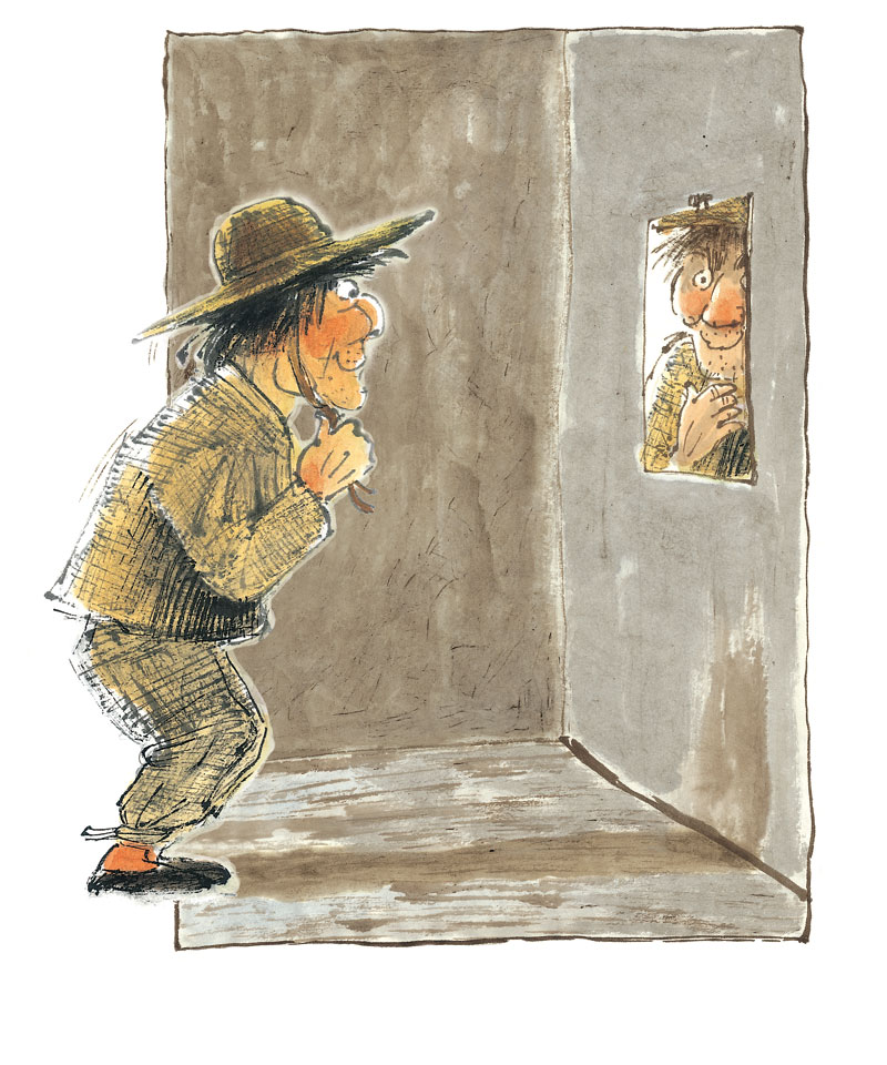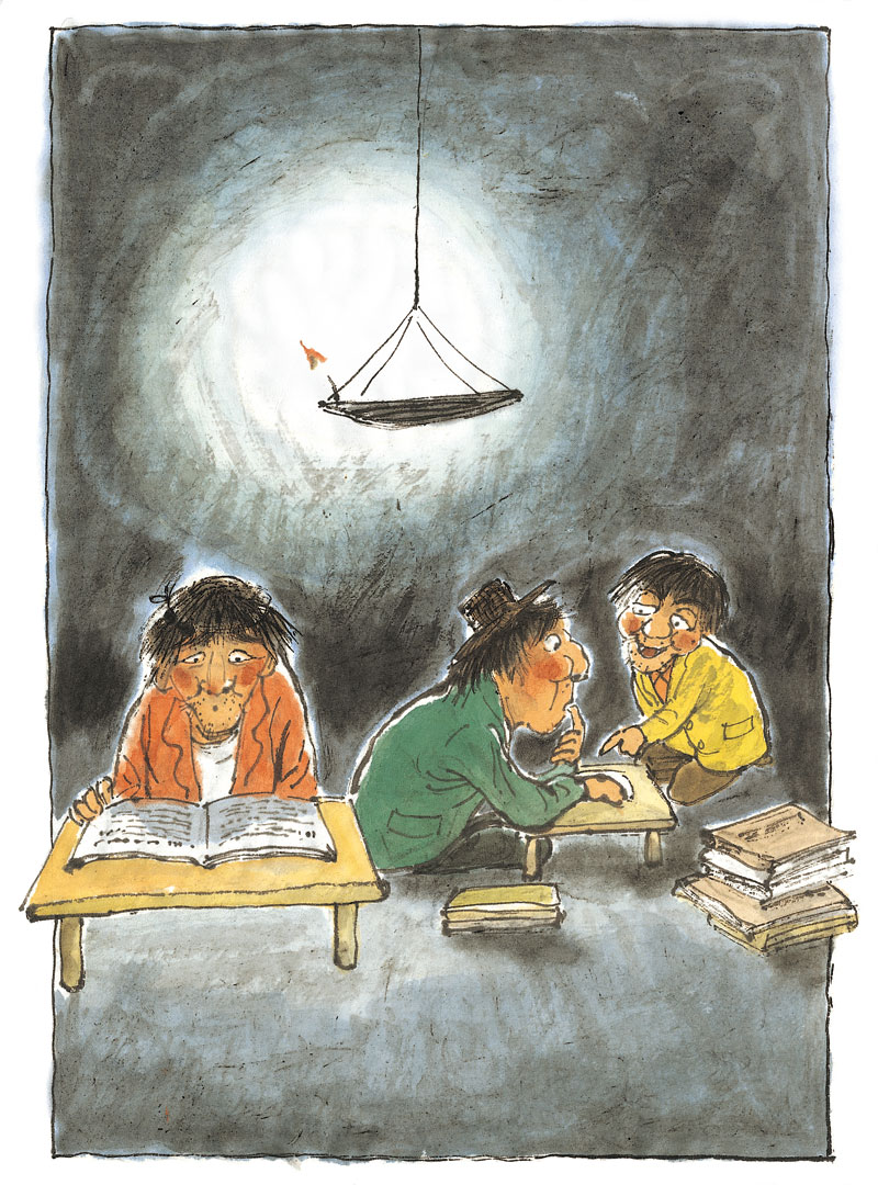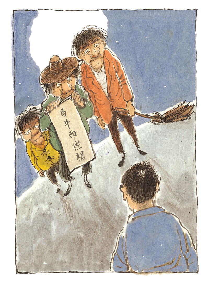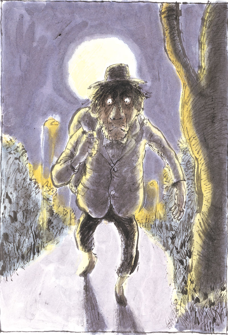 在一个月色皎洁的晚上,不知从何处来了一个脚步轻盈的男子,难道是踏着月光而来的客人?但细看才发现那人猫着腰,背着一个大袋子,一副鬼鬼祟祟的样子。他是个瘦高个儿,脸被凌乱的头发遮住了,眼睛、鼻子、嘴巴都看不清。这个家伙肯定是连夜行窃的小偷,头上还顶着一个破斗笠。