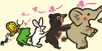 一只蚂蚁从洞里爬出来,不知向何处喊了一声“喂——”,翻页一看,哦!是只蝴蝶开心回答“哎——”。蝴蝶不知向何处喊“喂——”,翻页一看,哦!青蛙回答“哎——”……出场动物一个比一个大,此起彼伏的呼唤和回应将它们一个个凑到一起……作为宝宝启蒙的第一本绘本,不断重复的两个简单的生字贯穿全书,就连给0岁新生儿都能带来愉悦的阅读初体验。