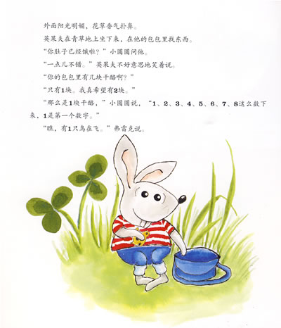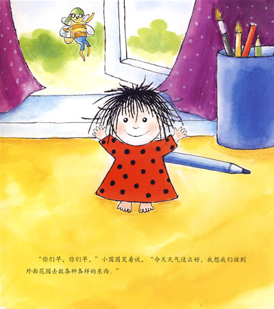 婴幼儿小朋友读这套书,建议先从《早上好》《从1数到10》《圣诞快乐》这3册开始,很好识别的,这3册都是20开。《早上好》中小朋友们最喜欢看的是鲜艳的色彩:小圆圆的裙子就有红、黄、绿,花园里的色彩就更缤纷了,粉蓝的蝴蝶,绿色的大叶子,紫色的小伞菇……《从1数到10》,是教给小孩子数的概念。回想七八年前我们自己带孩子,对数的认知,大多是通过卡片、挂图学习的。而阅读小圆圆丛书,小朋友们因为对小圆圆形象的喜爱,进而喜欢她的故事和场景,认识活动和情感活动一起调动起来,很快便有了牢固的无意识记忆。翻译家任溶溶爷爷的翻译更加增色不少,“一块奶酪两朵花,三只蜗牛爬呀爬,四只瓢虫在路上,五只蜜蜂独恋花……”