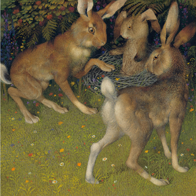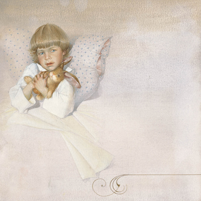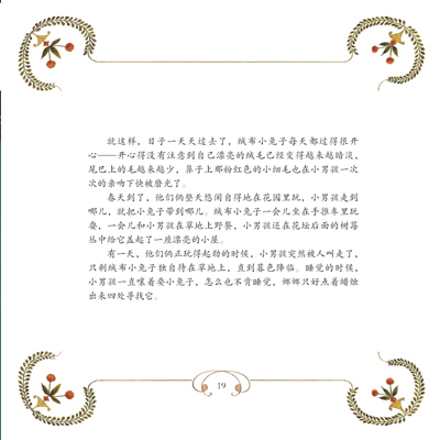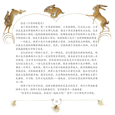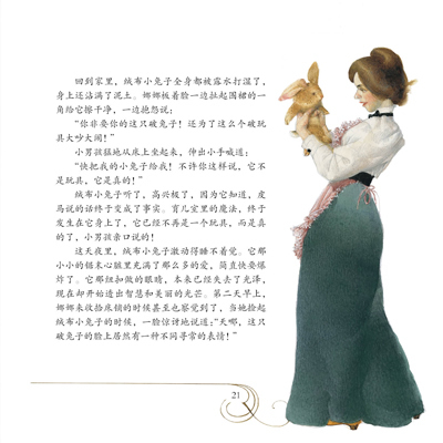 如此,真的不仅是孩子,成人也需要重温一点童话为我们日常理性、严谨、逻辑、缜密的思维松松绑,一释疲惫。或者我们可以暗自庆幸:正因身边的这个每晚等着要听故事的孩子,我们才有机会与童年、与童话再度相逢。如此,以我们的读书声去激活书中的男孩与他的绒布小兔子吧,在图、文之外赋予他们更为鲜活的声音,激活书中图、文背后缓缓流动的爱与真情,感悟那些“即便无他、我仍真爱”的心境,与孩子们一同见证故事最终——魔法仙女如何因男孩内心对绒布小兔子的真爱而激活了小兔子的生命,成就了那一份回归到生活中的真实……