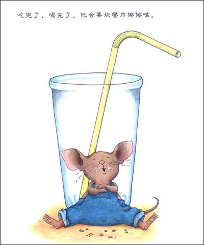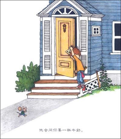故事的开始,“要是你给老鼠吃饼干,他会要杯牛奶。”—就这样,身穿牛仔背带裤、背着双肩背书包的小老鼠,接受了一个男孩子的一块饼干,因此走进了男孩的家里,去喝一杯牛奶。等到你给他牛奶,小老鼠要一根吸管,吃了喝了,小老鼠又向你要餐巾纸,还要照镜子,照了镜子又要……最后,“他会要杯牛奶来喝,既然他要喝牛奶,自然会要块饼干来吃。”故事就在这里结束,又回到了开始;而且通篇反复着一种句型:“要是……他会……”,极其单纯,极其迷人。