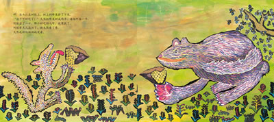 《阿狼的朋友》则是一个温馨的故事。阿狼在路上遇到了一只大熊,大熊约阿狼一起去找食儿。可是阿狼一来不喜欢和他人交往,二来怀疑大熊居心叵测,所以千方百计想甩掉大熊。大熊却完全看不出阿狼的心思,一路上跟着阿狼,并且不但搞来蜂蜜请阿狼吃,还在阿狼快要掉下山崖的时候向他伸出救援之手。大熊亲切的举动使阿狼抱着试一试的心情接受邀请和大熊一起去捕鱼。两个人配合,不一会儿就捉到了很多鱼。这使阿狼和大熊都感到很愉快。和大熊的相遇,给阿狼留下了美好的记忆。尾页上阿狼的洞窟中挂着大熊的画像,而阿狼的表情呢,是那样甜蜜和陶醉。虽然还是喜欢独处的生活,但阿狼的心被大熊的友情温暖着。