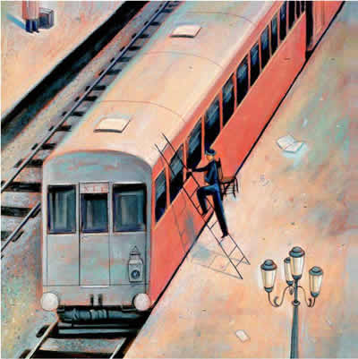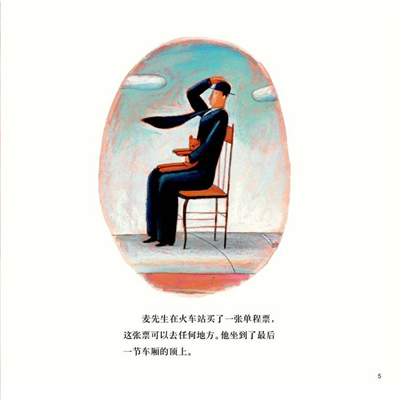 本书还有一个特色就是人物细节的处理。开始麦先生一个人在旅行时,他的表情是木讷的,而与之形成鲜明对比的是周围人们脸上欢快幸福的表情。可是到了故事的后半部分,麦先生的表情也发生了变化——他露出了久违的笑容。再看看最后一页,他和小男孩坐在车厢顶上,正微笑着开始下一站的旅行,这无疑是在暗示着一个美好的未来。