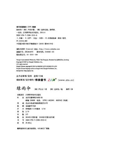 ★ 翻开《绿雨伞》,随着一幅幅图画、一个个场景的铺陈与展开,如同看一场电影一般进入故事世界。我们跟着主人公英英,一起漫步在淅淅沥沥的小雨中,一起感受她和乞丐爷爷的情感交流,她的心理变化,然后是无声的感动。 在简单与单纯的故事背后,传递的其实是关于勇气、关于善良、关于感动——这些都是孩子在成长的阶段经历。读完之后,无论是故事,还是画面,都给读者淡淡的诗意和浓浓的暖意的享受。世界因为善的存在而美丽。