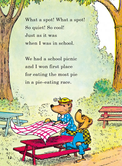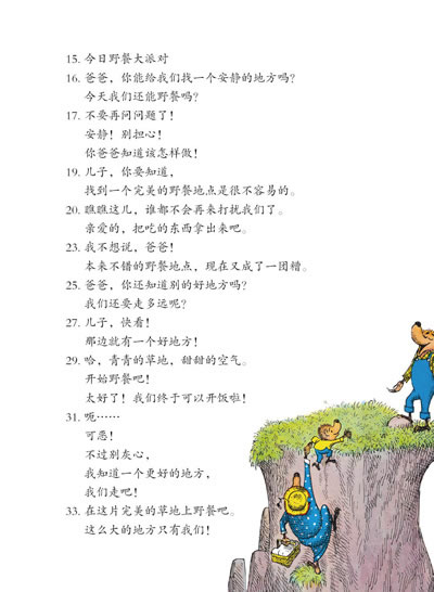 美国兰登书屋的品质保证,诗歌体的翻译??一只聪明的熊,一只有办法的熊……”桥断了,小熊们没人打一个童子军结荡过去,熊爸爸差点摔下去;导游手册上说要走远路,熊爸爸非要走近路,结果遇到了鳄鱼……