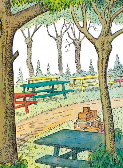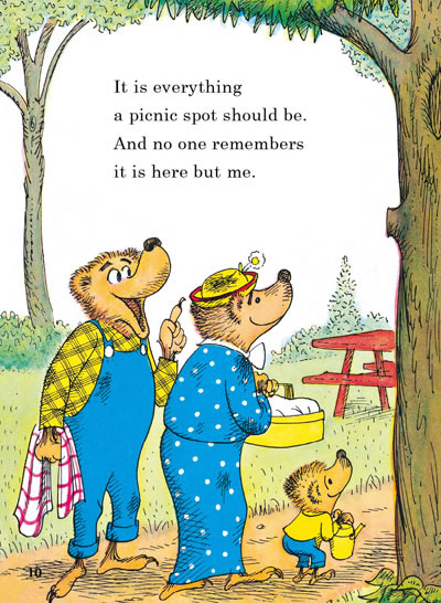 聪明伶俐、活泼可爱的小熊是跟在爸爸身后的“小尾巴”,他的脑子里总是装着一连串好奇的小问号,没完没了地问:“你找到完美的野餐地点了吗?我们还要走多久啊?可以开饭了吗?……”